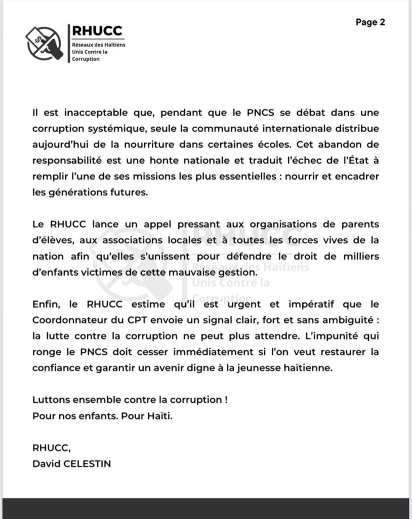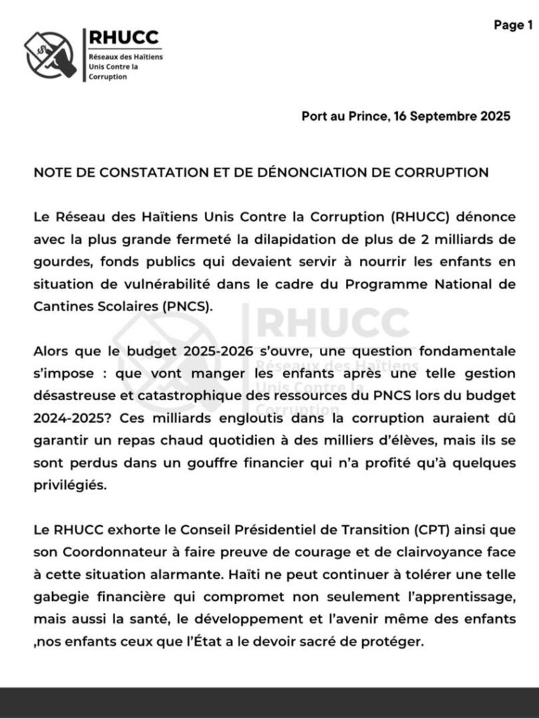Le RHUCC, dans sa note en date du 16 septembre, dénonce avec force « la dilapidation de plus de 2 milliards de gourdes, fonds publics qui devaient servir à nourrir les enfants vulnérables ». Le réseau s’interroge sur ce que vont manger les enfants après une telle gestion désastreuse et catastrophique, rappelant que ces milliards engloutis auraient dû garantir un repas chaud quotidien à des milliers d’élèves.